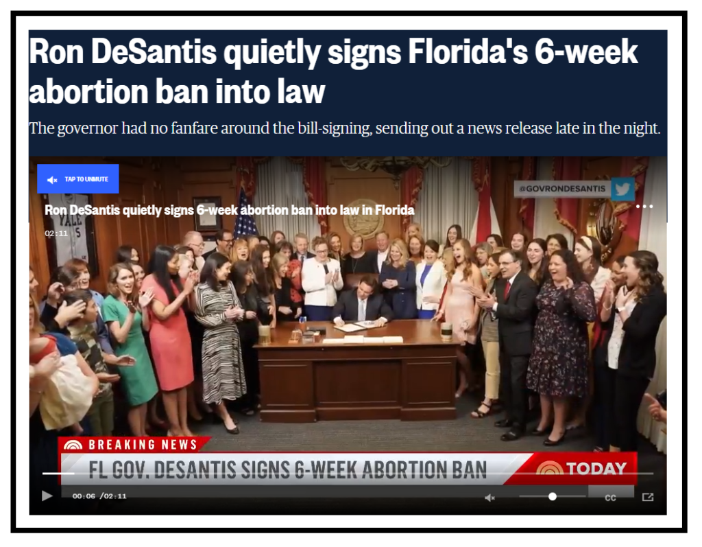 “6 Week DeSantis” is so proud of new Abortion Ban Bill that he signs it under wraps in the dead of night.